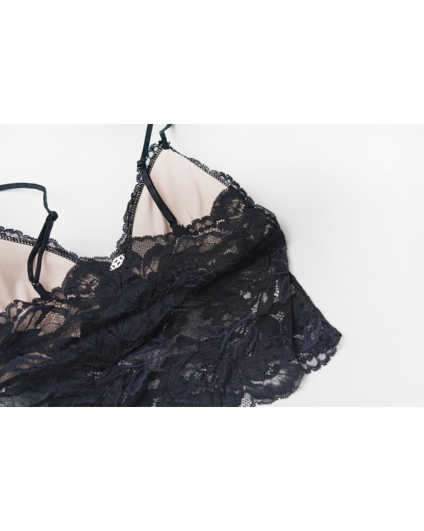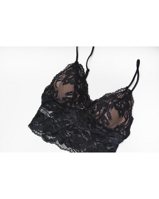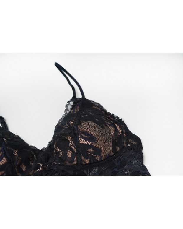 Hookless back, optimum coverage and support, stretch-lace material features mesh lining on the waist creating a see-through effect on your skin.
