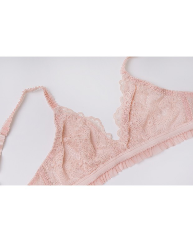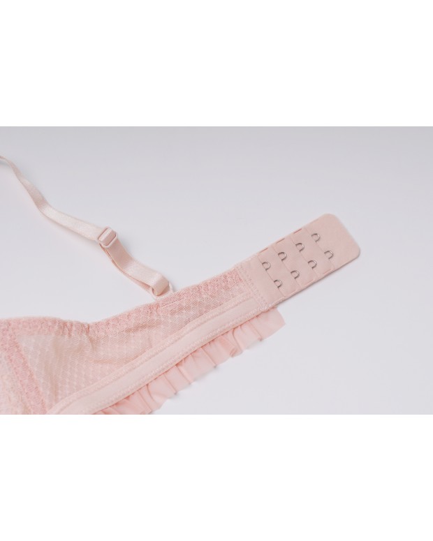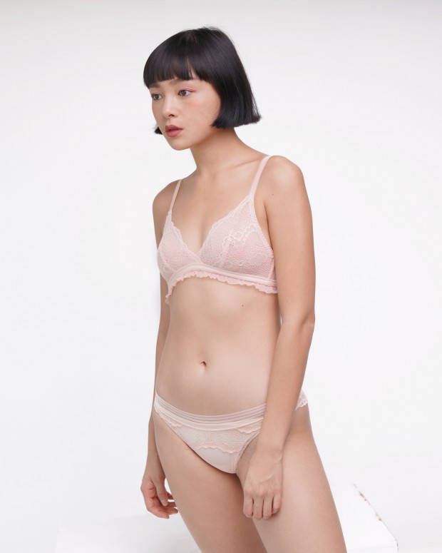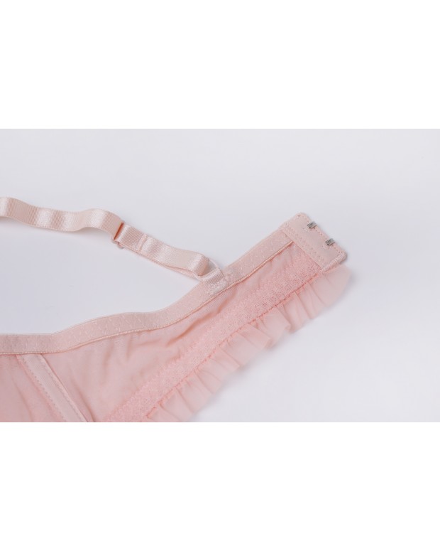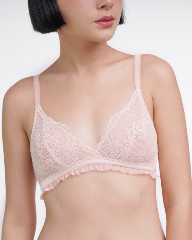 Composed of lace and mesh lining features pleated straps and edges, striking a balance between feminine and cuteness with shade of blush.